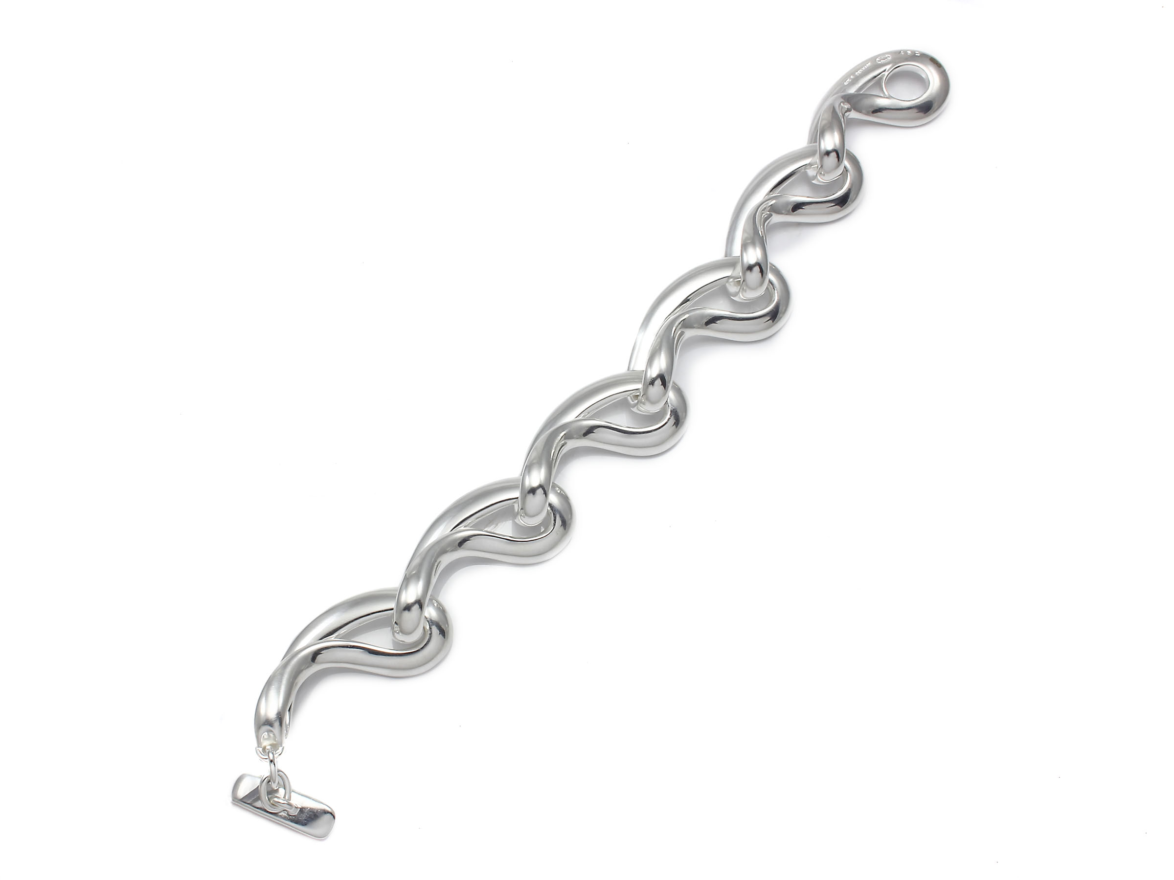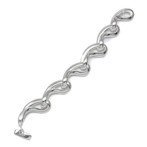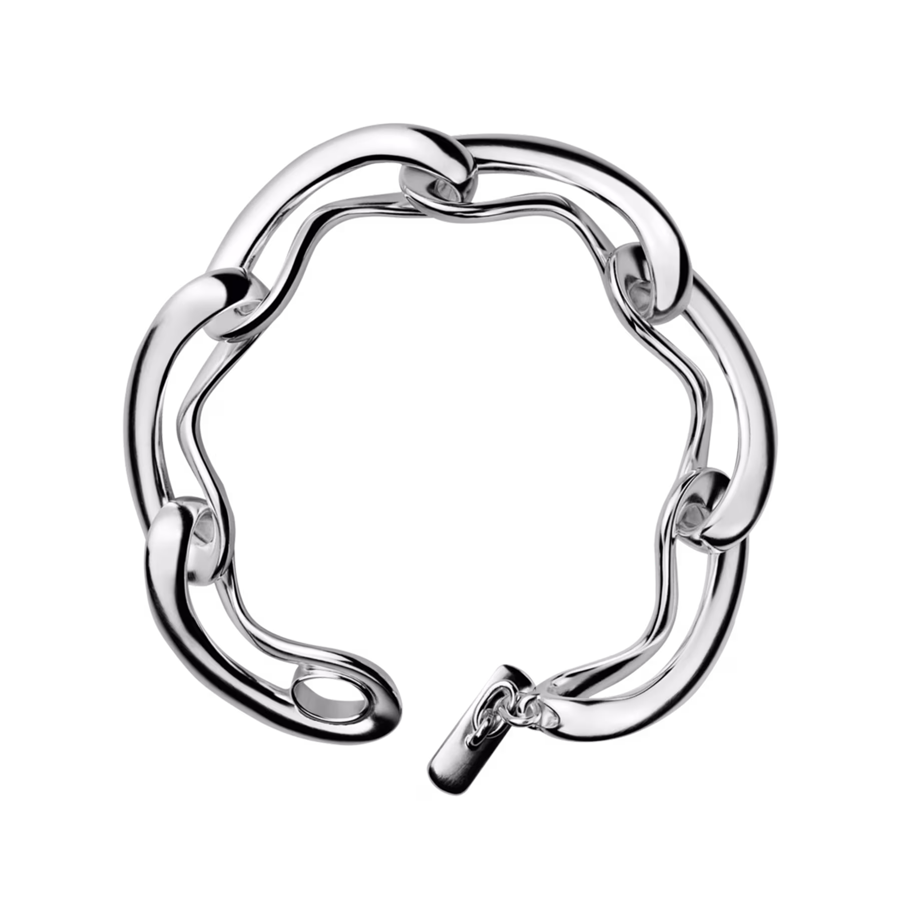 A contemporary and sculptural take on a traditional piece of jewellery, this striking sterling silver bracelet uses over-sized organically shaped links to dramatic effect. The abstract shapes are in fact based on the mathematical symbol for infinity, giving the bracelet an additional layer of meaning: a beautiful expression of endless love.